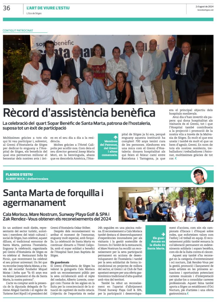 El passat 30 de juliol va tenir lloc el 4t Sopar benèfic de Santa Marta 2024, patrona de l’hostaleria, a l’hotel Calipolis i per a recaptació de fons per a la Fundació de l’Hospital Sant Joan Baptista que aquest any celebra els seus 700 anys de camí. L’hospital, d’hospitalitat des dels seus orígens i que els darrers anys continua amb la seva gran tasca per a la cura de les persones