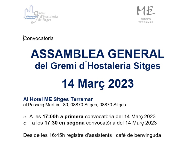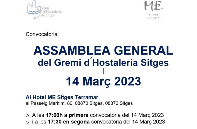 El proper 14 de Març de 2023 tindrà lloc a l’Hotel ME Sitges Terramar, ubicat al Passeig Marítim, 80, de Sitges l’Assemblea General Anual del Gremi d’Hostaleria de Sitges al següent horari