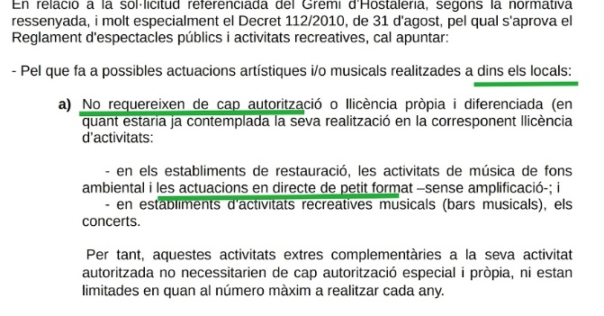d’actuacions de petit format i per a tenir música ambient als espais oberts i terrasses de titularitat privada i a les terrasses autoritzades en el domini públic d’establiments d’hostaleria i restauració.