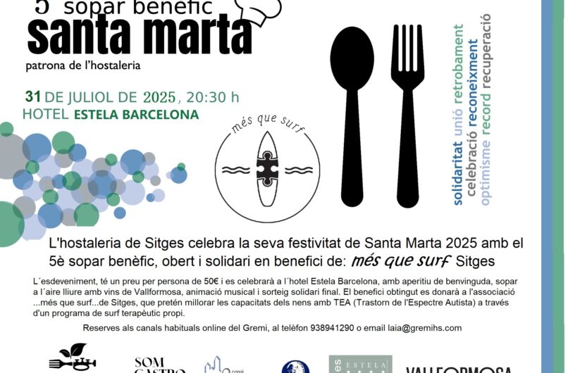El passat dia 31 de juliol vem celebrar el 5è Sopar Benèfic del Gremi d’Hostaleria de Sitges en favor de l’associació local Més que Surf entre un centenar d´amics, empresaris, agremiats, institucions, associacions locals, junta del Gremi, regidors de l´ajuntament de Sitges, Alcaldessa i regidors de Gover, president del Consell Comarcal del Garraf i la …