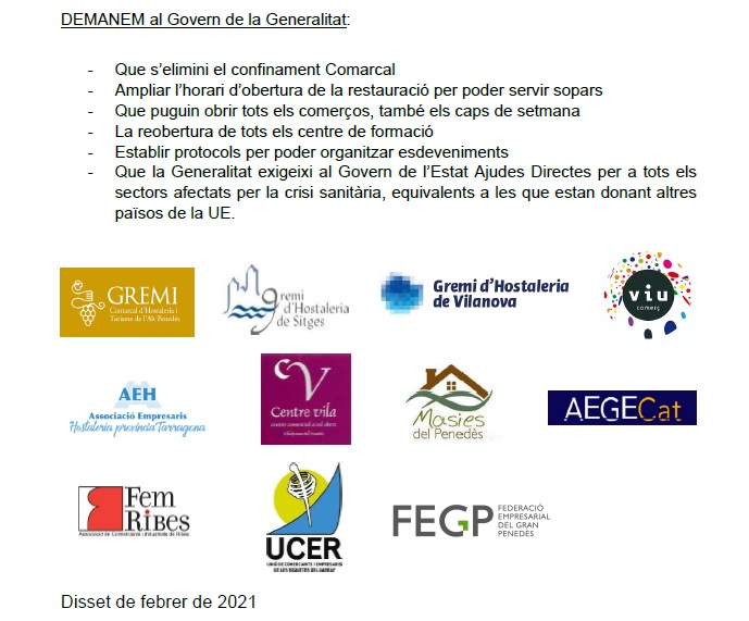 – Que s’elimini el confinament Comarcal – Ampliar l’horari d’obertura de la restauració per poder servir sopars – Que puguin obrir tots els comerços, també els caps de setmana – La reobertura de tots els centre de formació – Establir protocols per poder organitzar esdeveniments – Que la Generalitat exigeixi al Govern de l’Estat Ajudes Directes per a tots els sectors afectats per la crisi sanitària, equivalents a les que estan donant altres països de la UE