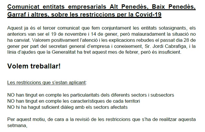 Comunicat entitats empresarials Alt Penedès, Baix Penedès, Garraf