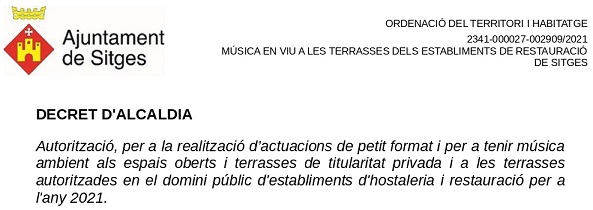Decret sobre actuacions musicals acústiques i ambientació musical a les terrasses per al 2021 a Sitges