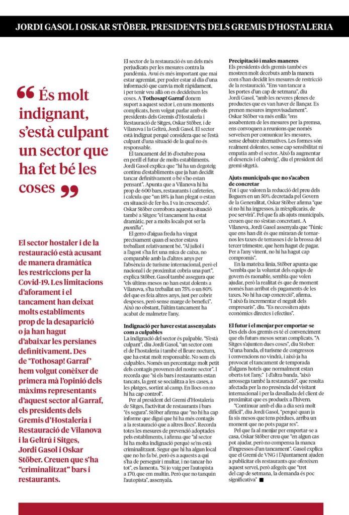 Arrel del tancament entre d’altres de l’hostaleria i la restauració Decretat per la Generalitat de Catalunya el passat 16 d’octubre, la revista Tothosap! Garraf va concedir una entrevista als presidents dels Gremis d’hostaleria de Vilanova i la Geltrú i Sitges, els senyors Jordi Gasol i Oskar Stöber respectivament per tal de copsar les sensacions i opinions que aquestes mesures tant dràstiques han creat als empresaris i treballadors del sector.