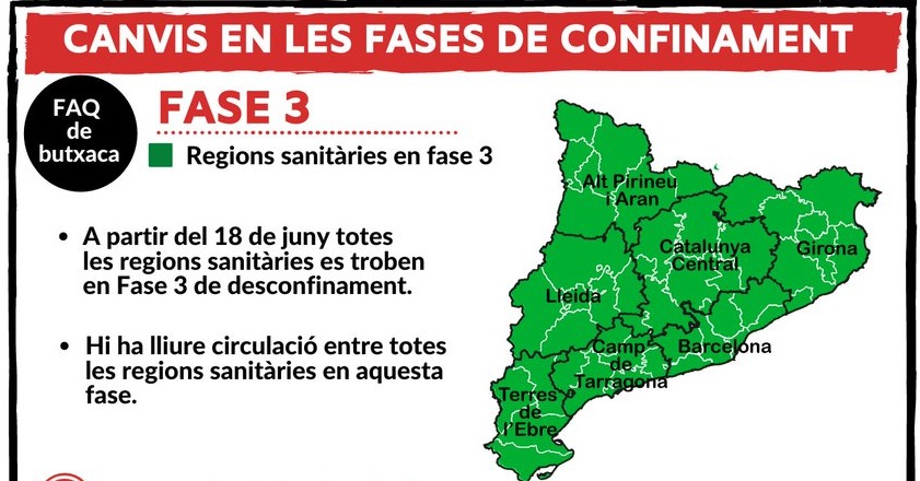 Des presidència de la Generaliatat, Protecció Civil i Mitjans de Comunicació se’ns indica que entrem en FASE 3, per unes hores, que la Conselleria de Salut de la Generalitat pren el control i que a partir d’el 25 de Juny, després d’un Sant Joan controlat , s’inicia l’anomenada nova normalitat que serà regida pel PROCICAT