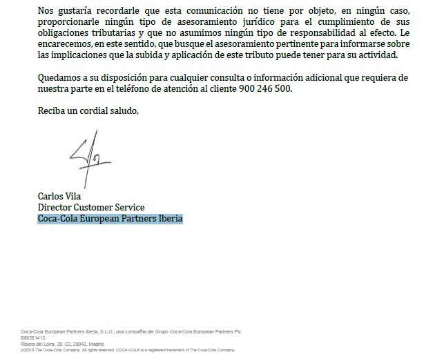 Coca-Cola European Partners Iberia ja ha transmès als establiments d’hosteleria la nova càrrega impositiva i s’ha posat a disposició del sector per al que necessitin. Gràcies Coca-Cola per donar l’espurna de la vida i ser uns dels nostres partnes més importants