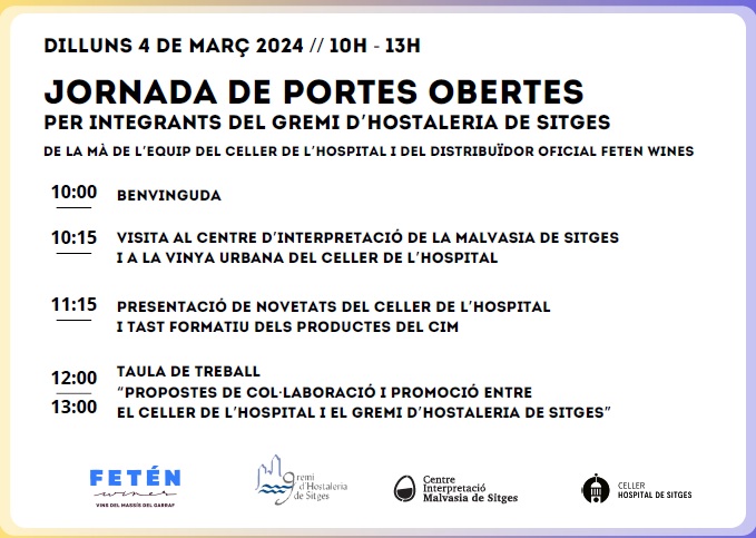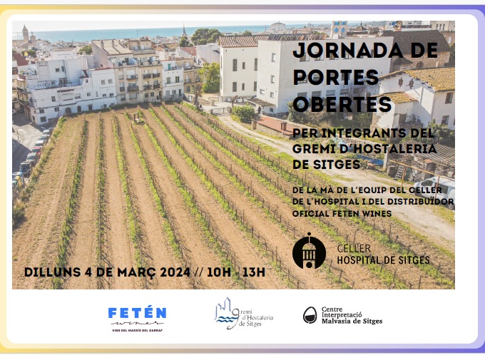 El proper dilluns 4 de MARÇ 2024 de 10h – 13h tindren Jornada de portes obertes per integrants del Gremi d’Hostaleria de Sitges al CIM. De la mà de l’equip del Celler de l’hospital i del distribuïdor oficial Feten Wines