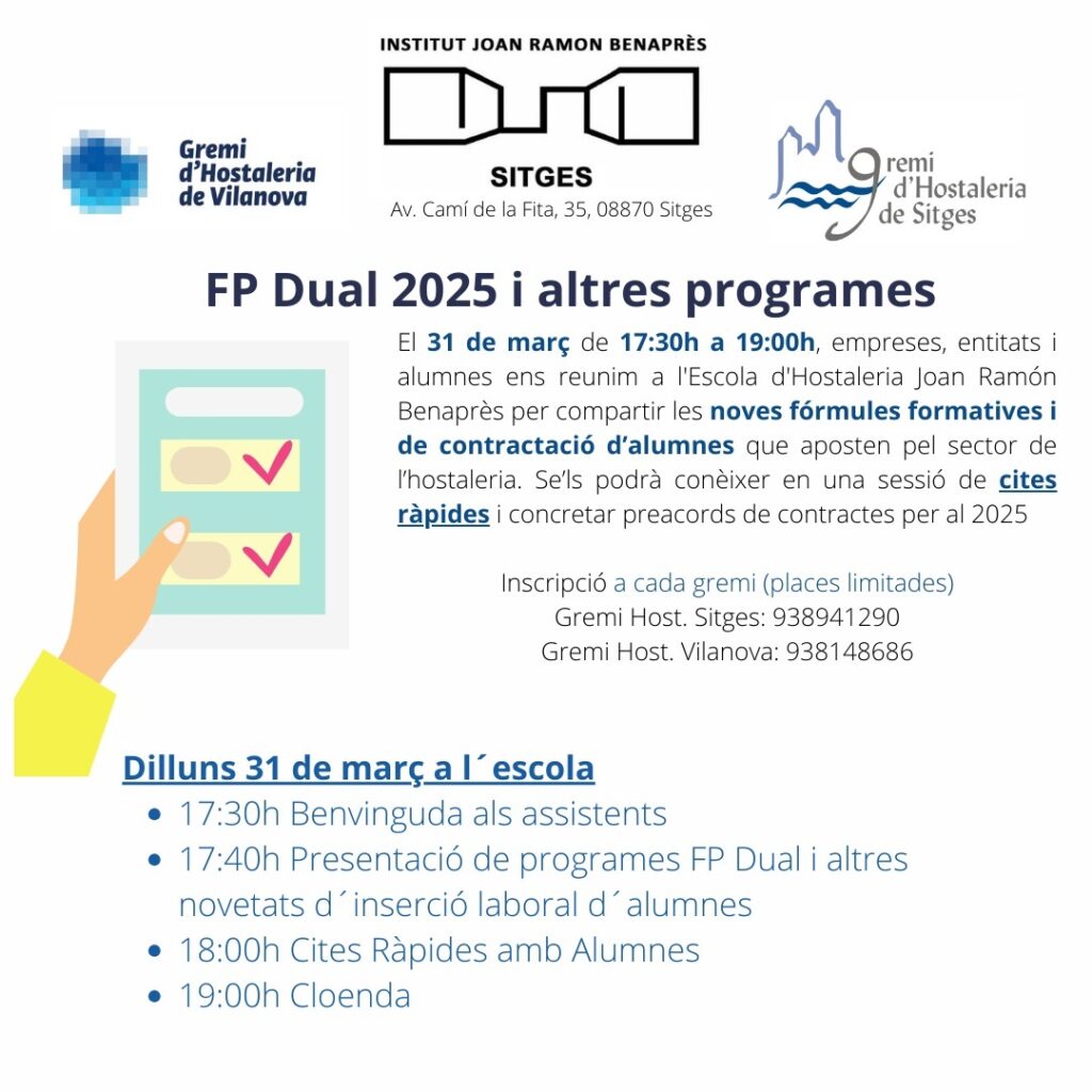 Després de la cancel·lació de la jornada inicial del passat 17 de març per vaga de trens, tornem a llançar l’edició el proper 31 de març de 2025 de 17:30h a 19:00h en aquesta segona edició, empreses, entitats i alumnes ens reunim a l’Escola d’Hostaleria Joan Ramón Benaprès per compartir lesnoves fórmules formatives i de contractació d’alumnes que aposten pel sector de l’hostaleria. Se’ls podrà conèixer en una sessió de cites ràpides i concretar preacords de contractes per al 2025.