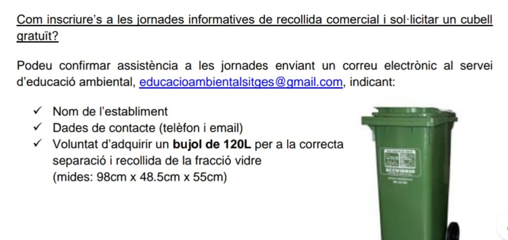 Des de l’Ajuntament de Sitges s’inicia una campanya informativa adreçada als responsables dels establiments comercials del sector HORECA amb l’objectiu de donar-vos suport en la correcta gestió dels residus que es genera , recordar la normativa vigent en matèria de residus, i millorar el servei de recollida comercial