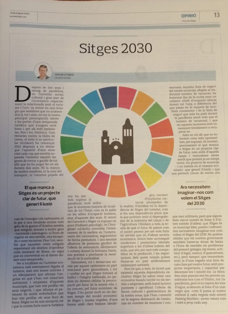 Us deixem article d’opinió d’Oskar Stöber, president del Gremi al setmanari L´Eco de Sitges del 13 de Maig de 2022.