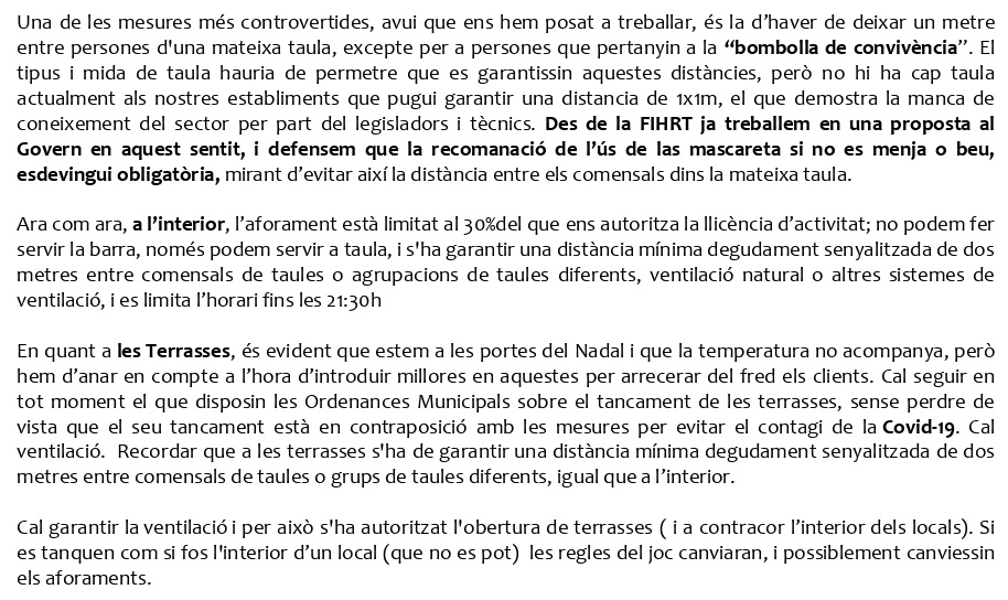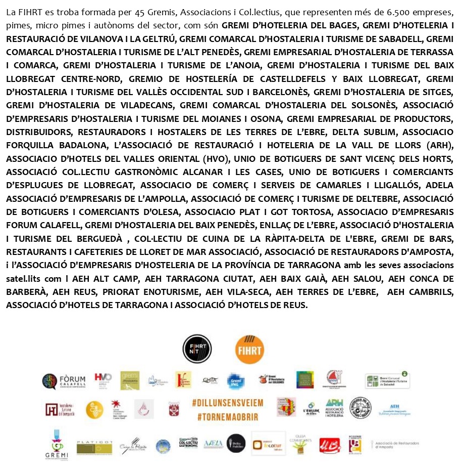 Després de quasi quaranta dies de tancament del sector, ahir vam obrir, però no s’hi val a baixar la guàrdia. Hi ha satisfacció però és continguda, perquè hem passat d’estar tancats, a obrir amb limitacions, i cal fer molts números per si val la pena obrir en aquests moments. Sembla que ens conformem i no és així. Els Gremis, Associacions i Col·lectius que formen la FIHRT demanem al sector un esforç per complir de manera escrupolosa el que se’ns demana des de la RESOLUCIÓ SLT/2983/2020, de 21 de novembre, per la qual es prorroguen i es modifiquen les mesures en matèria de salut pública per a la contenció del brot epidèmic de la pandèmia de COVID-19 al territori de Catalunya.