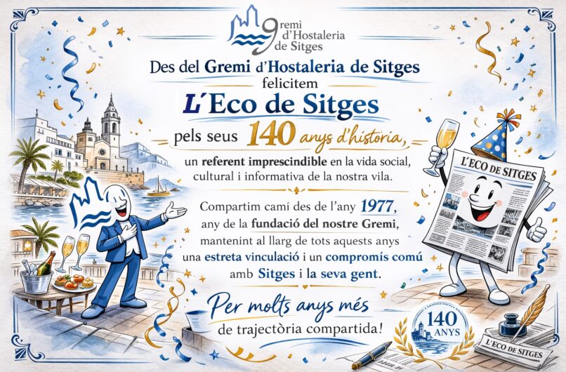 L’Eco celebra 140 anys Aquest diumenge 1 de març fa 140 anys que va aparèixer el primer número de L’Eco de Sitges, la publicació periòdica en paper més antiga de Catalunya.Per això des del Gremi d’hostaleria de Sitges, volem desitjar-vos un aniversari molt feliç I que en compleixis molts més By, gremi 27 de Febrer de 2026 209 General 0 comment CompartirClose PrevCatalunya duplica la taxa turística NextSitges acull una nova edició del Capvespre del Peix Senzill i anomena nous mariscals