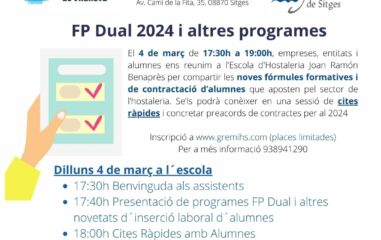 El 4 de març del 2024, de forma conjunta amb l’Escola d’hostaleria Joan Ramón Benaprés i els Gremis de Vilanova i Sitges reuneixen empreses i alumnes per planificar la temporada de pràctiques i contractació de Formació FP dual. A la ...- 5 de Març de 2024