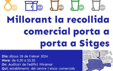 El 29 de febrer, al Centre Miramar de Sitges, de 09:30h a 10:30h Jornada Formativa per la millora de la recollida i gestió de residus porta a porta al centre de Sitges Amb el següent programa: Confirmar assistència al 607298351 De la jornada, ...- 23 de Febrer de 2024