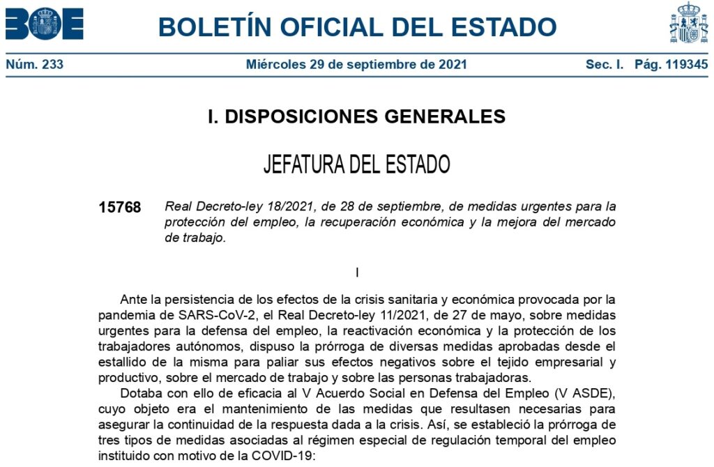 El 29 de setembre de 2021 s’ha publicat al BOE el Reial Decret-Llei 18/2021, de data 28 de setembre, de mesures urgents per a la protecció de l’ocupació, la recuperació econòmica i la millora del mercat de treball,  a continuació fem un recull de forma sumària de les novetats més destacables:
