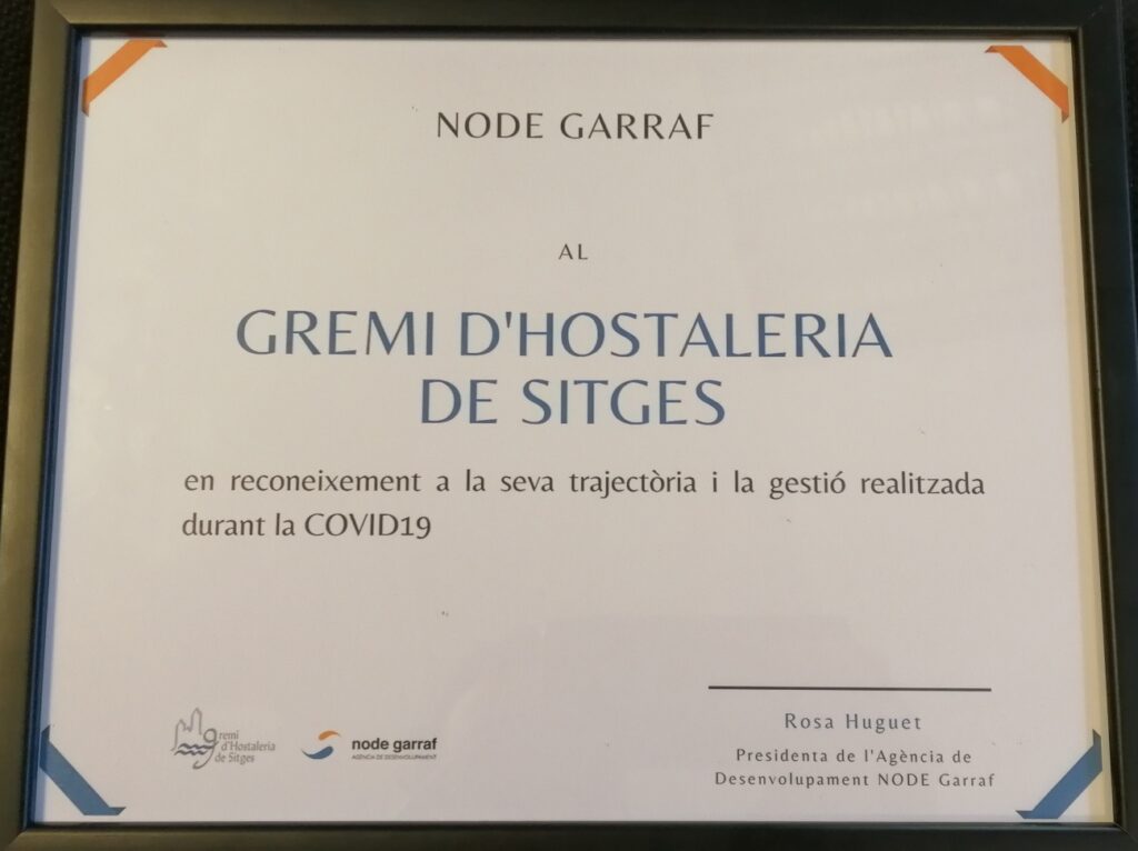 En un lloc fabulós, el passat 26 de maig vàrem rebre un reconeixement de Node Garraf per la tasca realitzada els darrers anys, per enfortir la dinamització del teixit empresarial de Sitges i també pel suport incondicional a les empreses agremiades i a tot el sector durant la pandèmia COVID19 que encara continua.