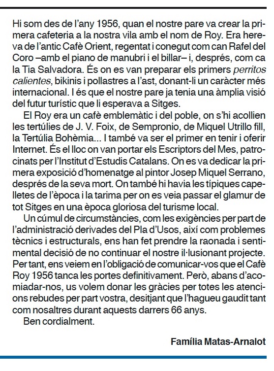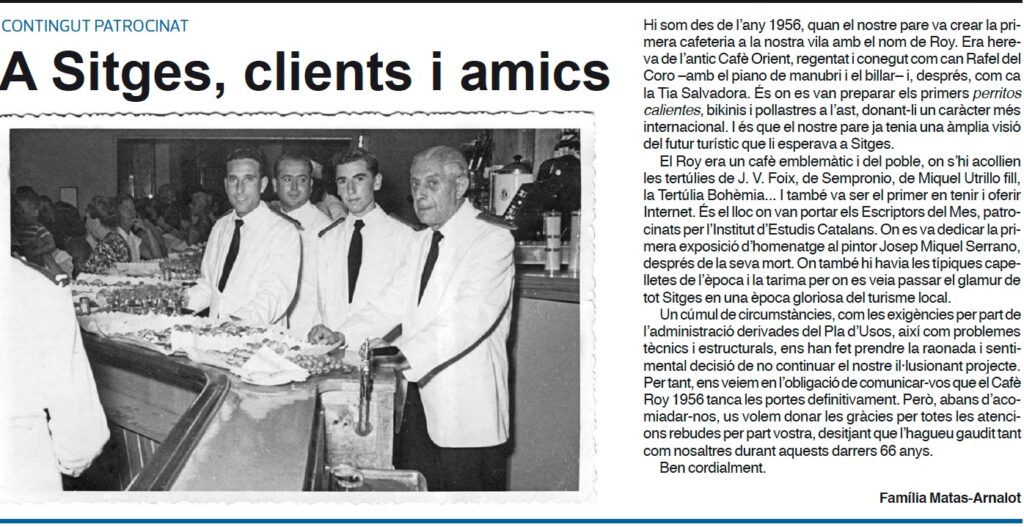 Roy 1956, us trobarem a faltar Dificil assimilar el tancament del Roy. La pèrdua d´un establiment històric de Sitges, referent de veïns, visitants i turistes.Molt difícil d’assimilar.Us deixem aquí el comunicat de la Família Matas-Arnalot Moltes gràcies per tots aquests anys i no defalliu amb la resta de projectes.Ànims i tot el nostre suport! By, gremi 8 d'Abril de 2022 894 General 0 comment CompartirClose PrevSitges Tapa a Tapa edició primavera NextL’Oci Nocturn de Sitges Viu la NiT