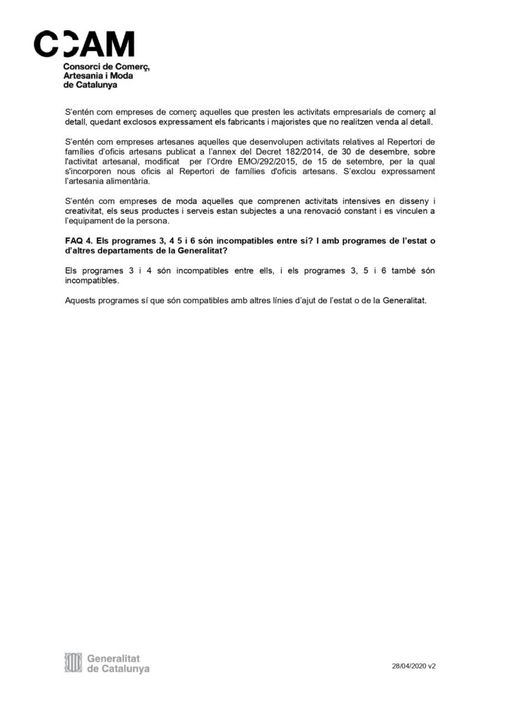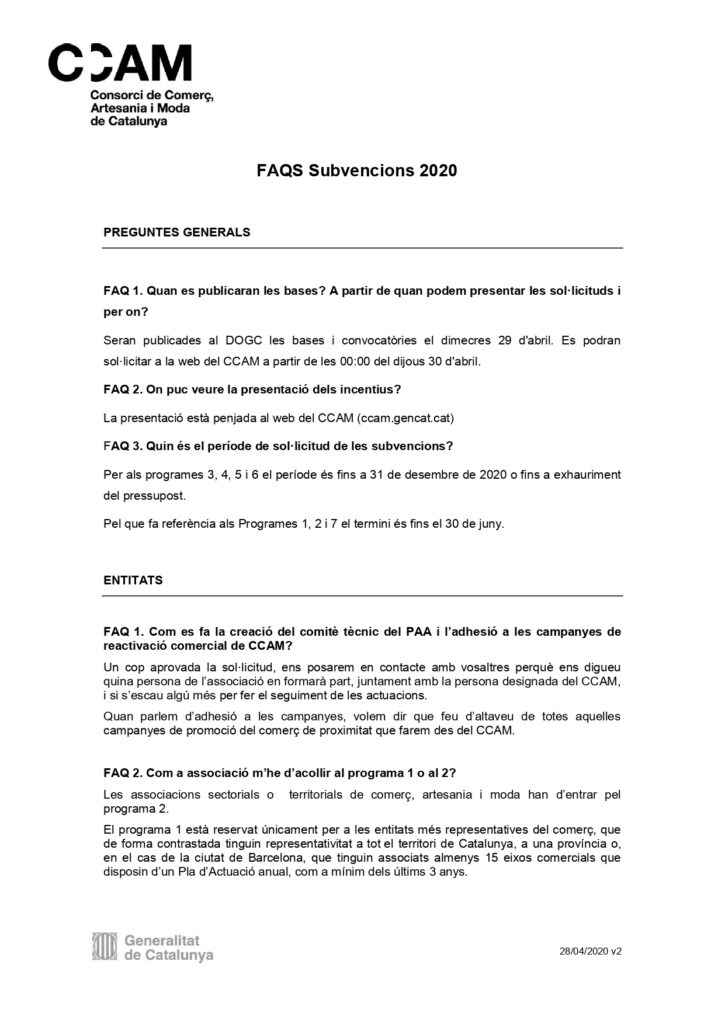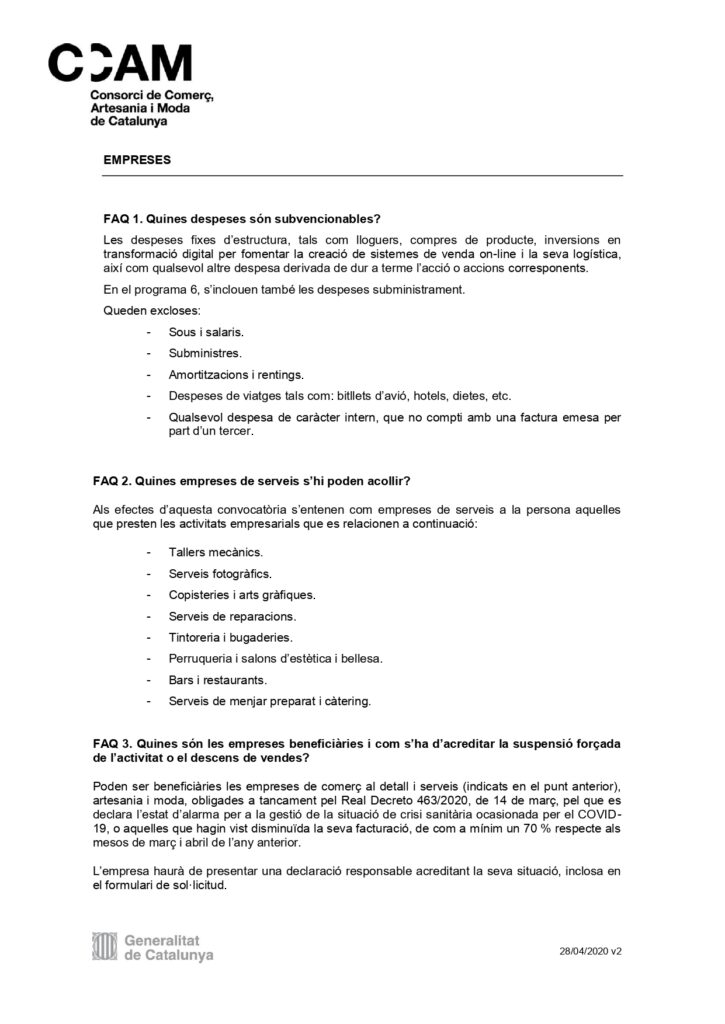 Adjuntem el document complert de la publicació al DOGC de la Resolució pr la qual s’aproven les bases reguladores per la concessió de subvencions en l’àmbit del comerç, els serveis, l’artesania i la moda afectats econòmicament per la COVID-19. Descarregueu-la Aquí.