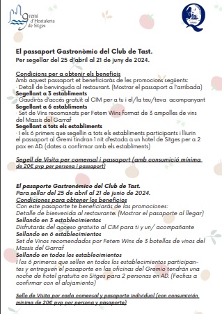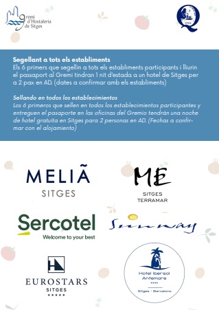 - I els 6 primers que segellin a tots els establiments participants i lliurin el passaport al Gremi tindran 1 nit d’estada a un hotel de Sitges per a 2 pax en AD. (dates a confirmar amb els establiments)
