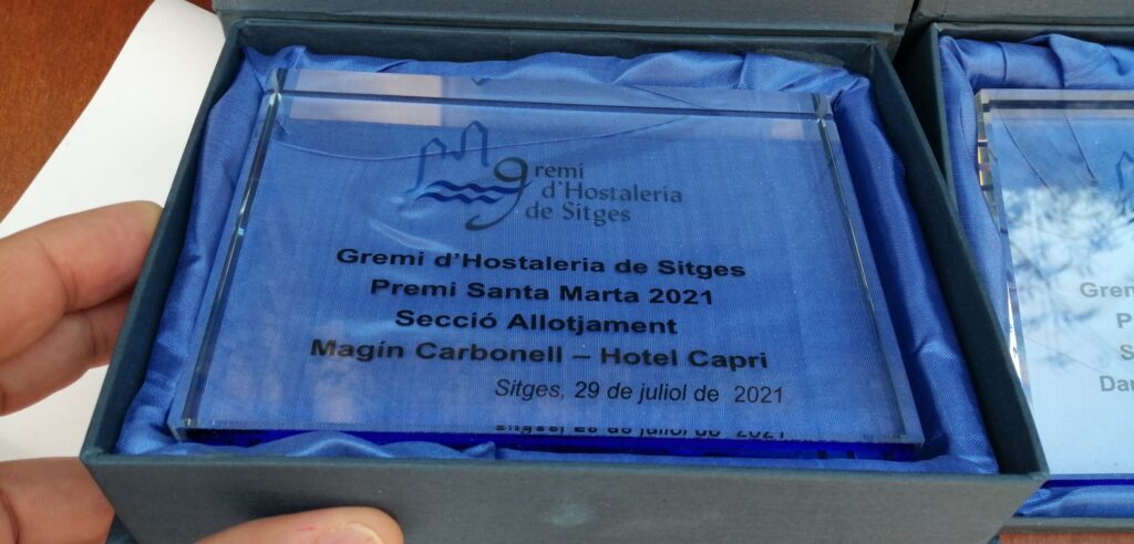 en reconeixement a la tornada. A tornar a començar, a tirar endavant projectes renovats, després d’un 2020 de COVID que va impedir l’obertura de l’hotel Capri l’estiu passat, després de dècades present a Sitges i que ara, a 2021, amb moltíssim esforç en totes les àrees, com tots els empresaris de Sitges, torna a estar al servei dels nostres visitants