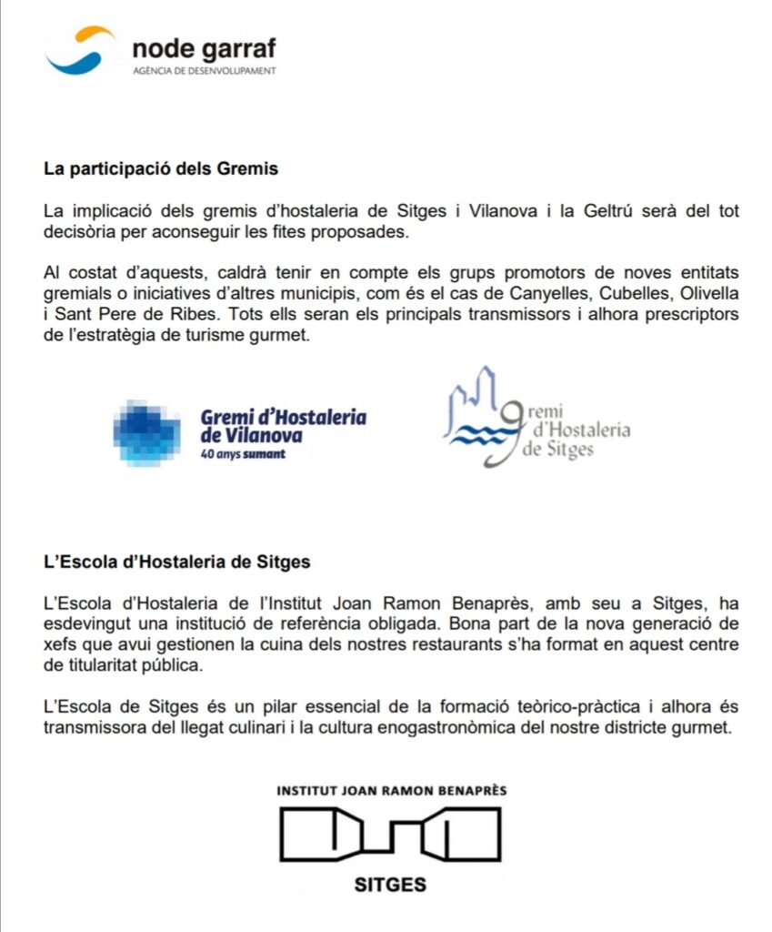 Node Garraf amb el suport de la Diputació de Barcelona, Ajuntaments de la nostra comarca i acompanyat pels Gremis d’Hostaleria de Sitges i Vilanova i la Geltrú reactiven la tasca de desenvolupar, donar a conèixer i comercialitzar la gastronomia i els productes de la terra de la nostra comarca tenint com a aliat fonamental l’Escola d’Hostaleria de Sitges IES Joan Ramon Benaprés i els productors de la nostra zona