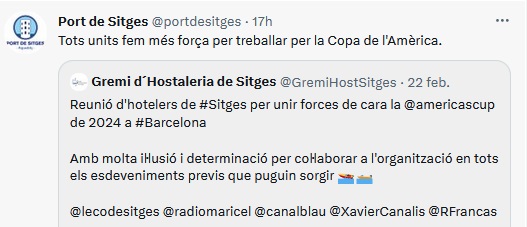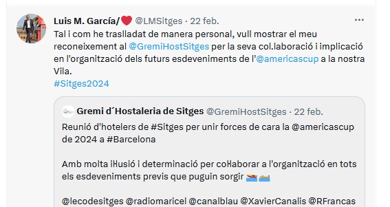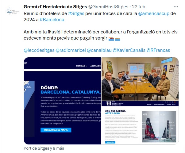 Des del Gremi d´Hostaleria de Sitges ja s´ha començat a treballar i unir esforços per estar a disposició de l´organització i autoritats facilitant al màxim el desenvolupament de la competició de 2024. A més, Sitges s’ofereix com a destinació de referència per a qualsevol tipus d’esdeveniment previ que es pugui fer a la nostra localitat